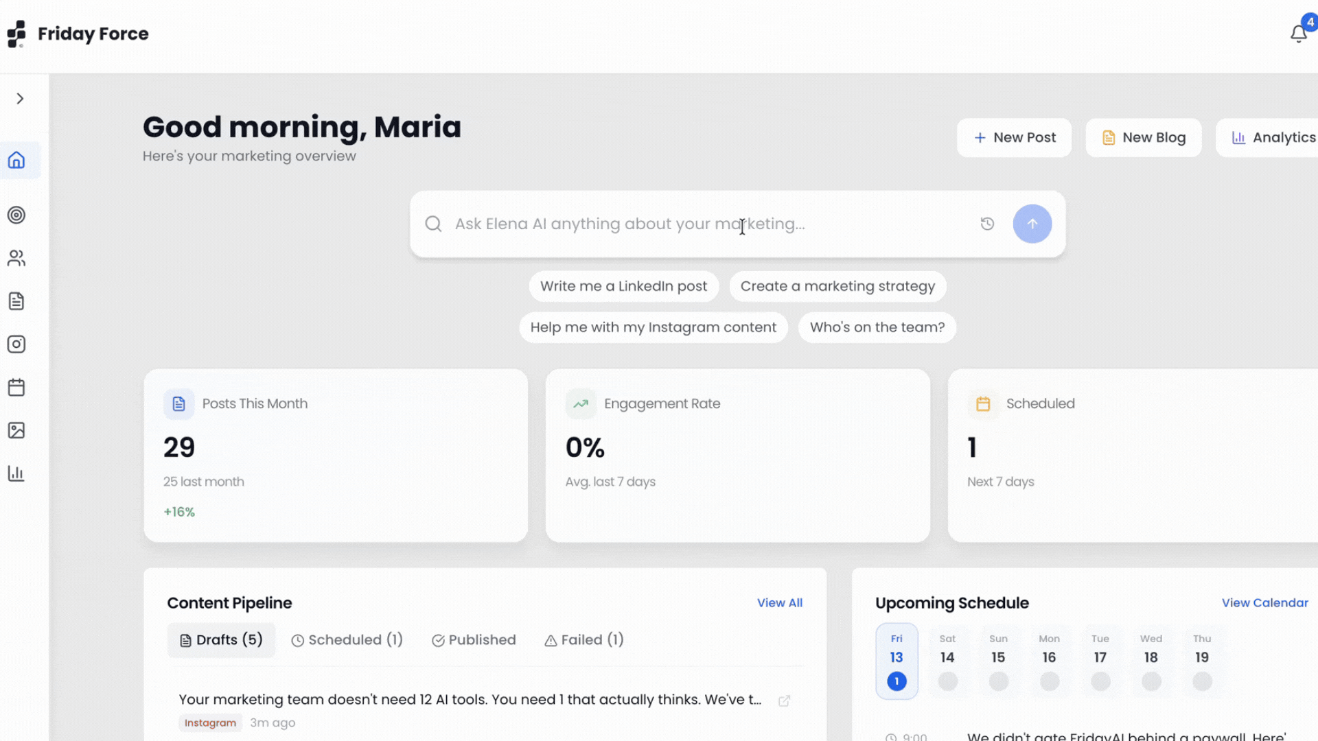 Elena is your go-to person for everything marketing. Just tell her what you need — like "write a blog post" or "plan my social media for the week" — and she takes care of the rest. No marketing experience required.